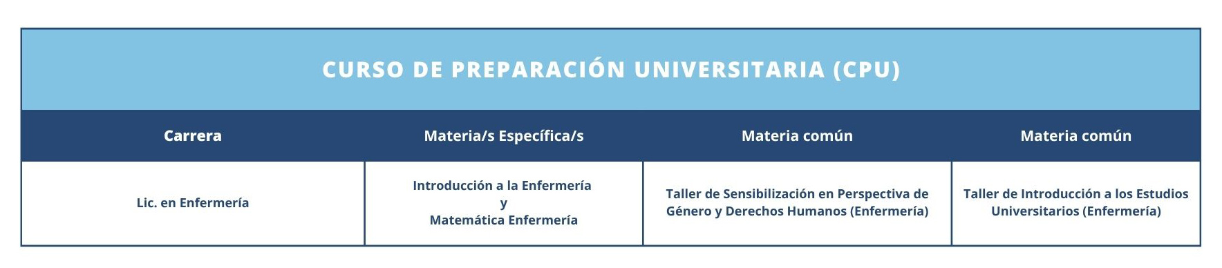 El Curso de Preparación Universitaria (CPU) para la carrera de Lic. en Enfermería es una instancia de formación obligatoria que se lleva a cabo durante el mes de febrero de 8 a 12 hs.